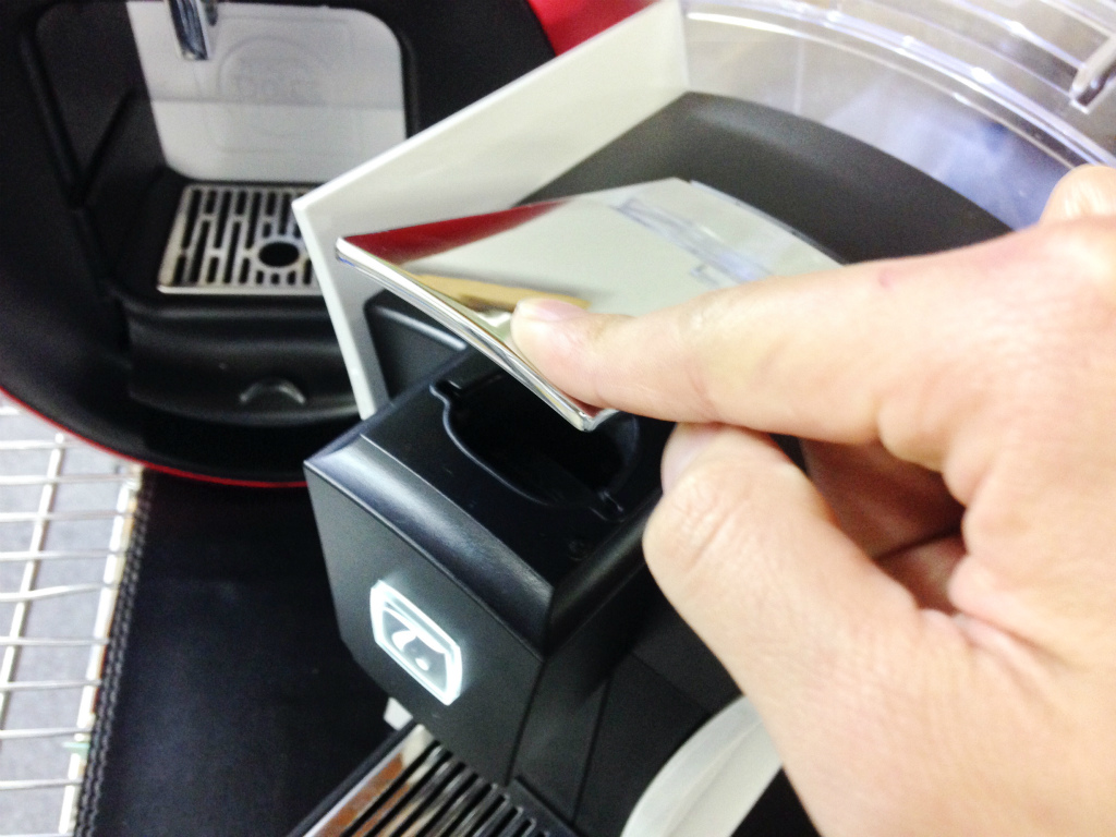 お好みの茶葉の入ったカプセルを、小さくなってる方を下に、平らな銀色の方を手前にして入れます。