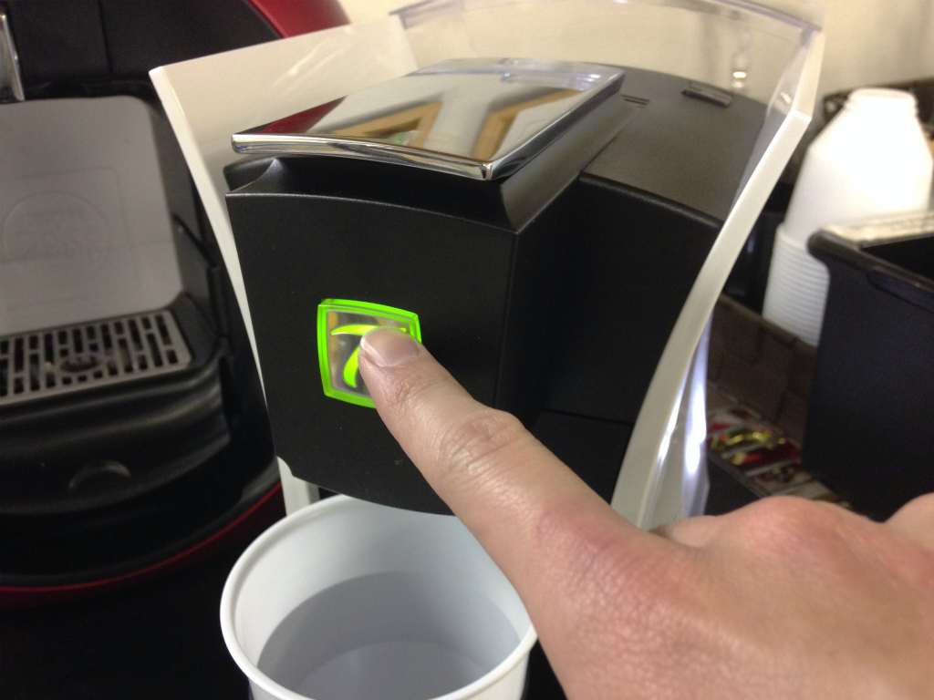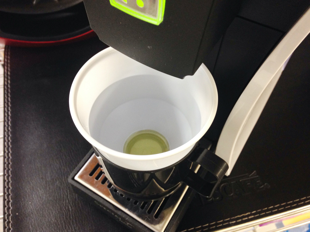 コップをセットして、いざ!緑色のボタンを押しましょう!ゆっくり、グッッと押してください。