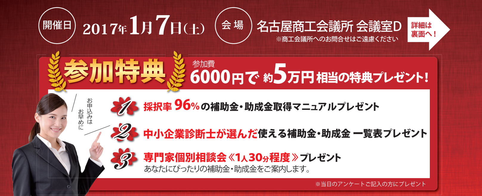 1月7日(土)午後2時~午後5時:『2017年 獲れる補助金&助成金 どこよりも早く対策セミナー実施! @ 名古屋商工会議所』